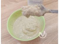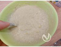Egy villával egy tányéron jó alaposan összetörjük a banánt, hogy banánpépet kapjunk. Ezután beletesszük egy kis kompótos tálba. Ekkor látjuk, hogy mekkora lesz a banán mennyisége. Hozzákanalazzuk a liszteket úgy, hogy a két liszt keveréke mennyiségre körülbelül ugyanannyi legyen, mint a banáné. Ne idegeskedjük túl, ha kicsit több a liszt, max nem lesz olyan édes a palacsinta. Ha kicsit kevesebb, akkor azt látjuk majd próbasütéskor, hogy lágy a palacsinta és teszünk még hozzá. Utána adunk hozzá kevés rizstejet. Mennyit? Kezdésnek kb. 3 evőkanálnyit, aztán mindig csak keveset kavarjunk még hozzá. Egy közepesen sűrű állagot kapunk. Túl sűrű még, ha felemeljük a villát és egyben esik le róla a tészta vagy le sem esik. Teszünk még hozzá növényi tejet. Akkor jó, ha könnyen kavarható a tészta és ha felemeljük a villát, akkor darabokban esik le róla. Megpróbálom képpel szemléltetni, de a próbasütéskor úgyis kiderül, ha nem jó az állag. Tényleg nem igazán lehet elrontani.