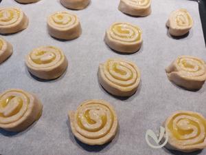 Amikor a tészta megkelt, vékonyan lisztezett deszkán kinyújtjuk téglalap alakúra, kb. 7-8 mm vastagságúra, majd rákenjük a pudingot és feltekerjük egy rúddá. Utána egy éles késsel kb. 1 cm vastag darabokat vágunk le és sütőpapírral bélelt tepsire tesszük a csigákat és ott még egy 10-15 percet kelni hagyjuk.